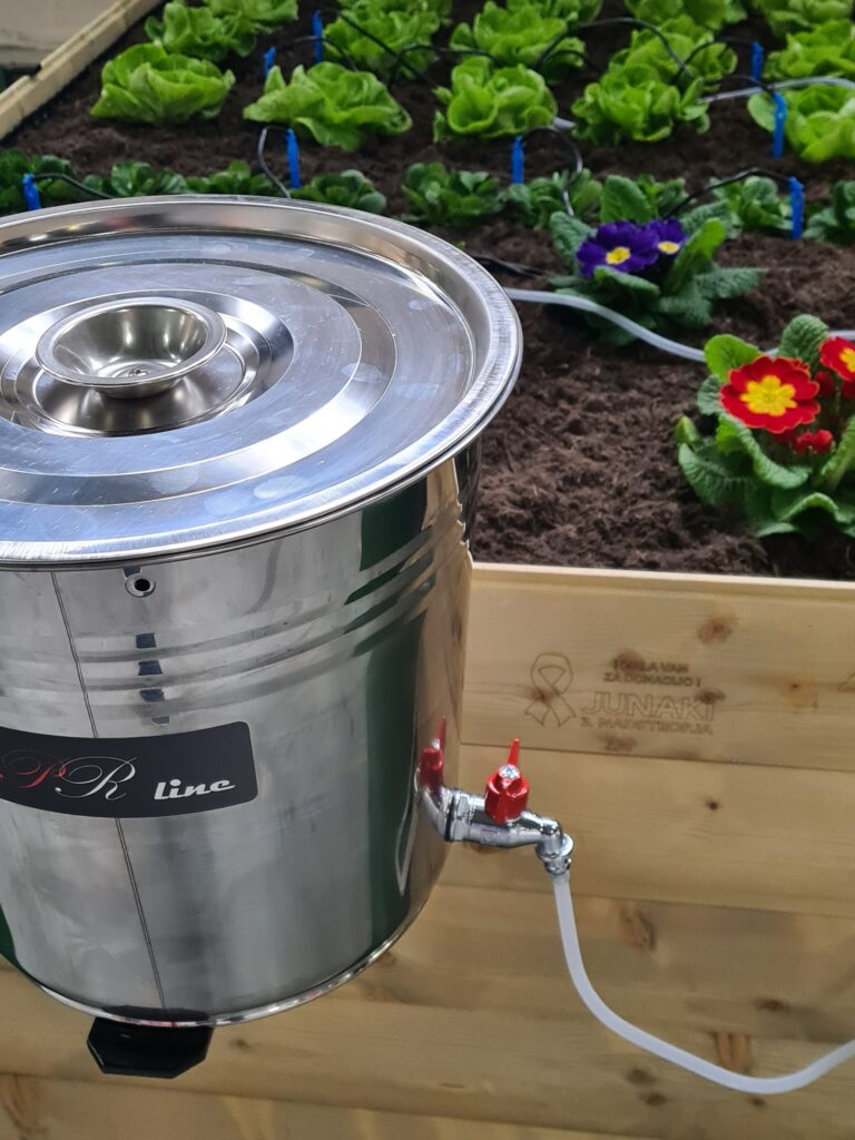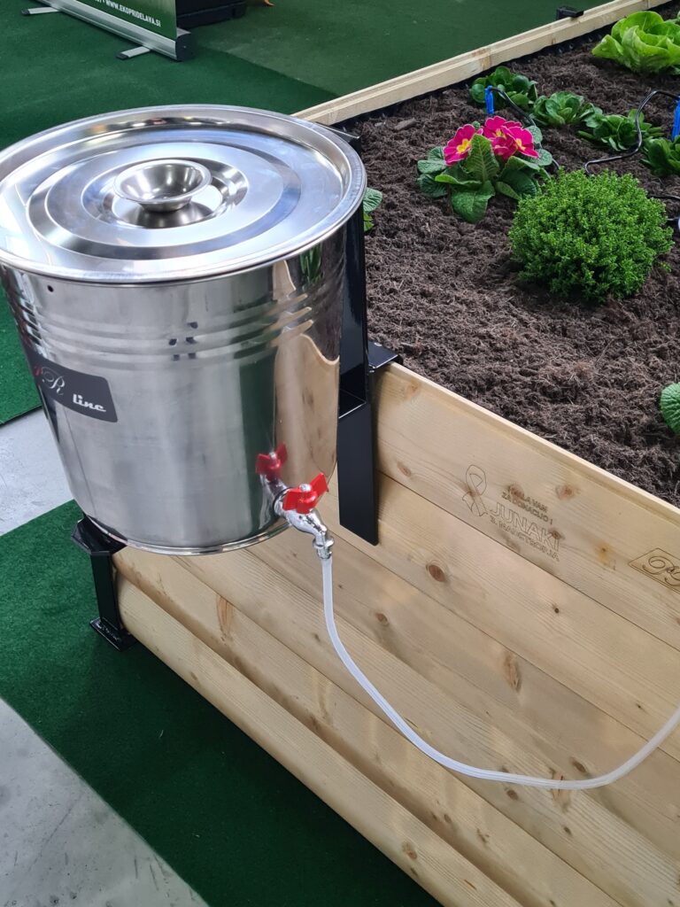 Zalivalni sistem; sistem drži cca 15 litrov vode. Doziranje poteka na podlagi razlike v višini nivoja vode, tako da ne potrebuje nobene dodatne pomoči v obliki vodne črpalke. Ventil omogoča regulacijo doziranja, kar omogoča počasno namakanje rastlin nekje dobra dva dni. V kompletu je priloženo 12 kapalk, ki se jih locira rastlinam, ki potrebujejo bolj intenzivno zalivanje.